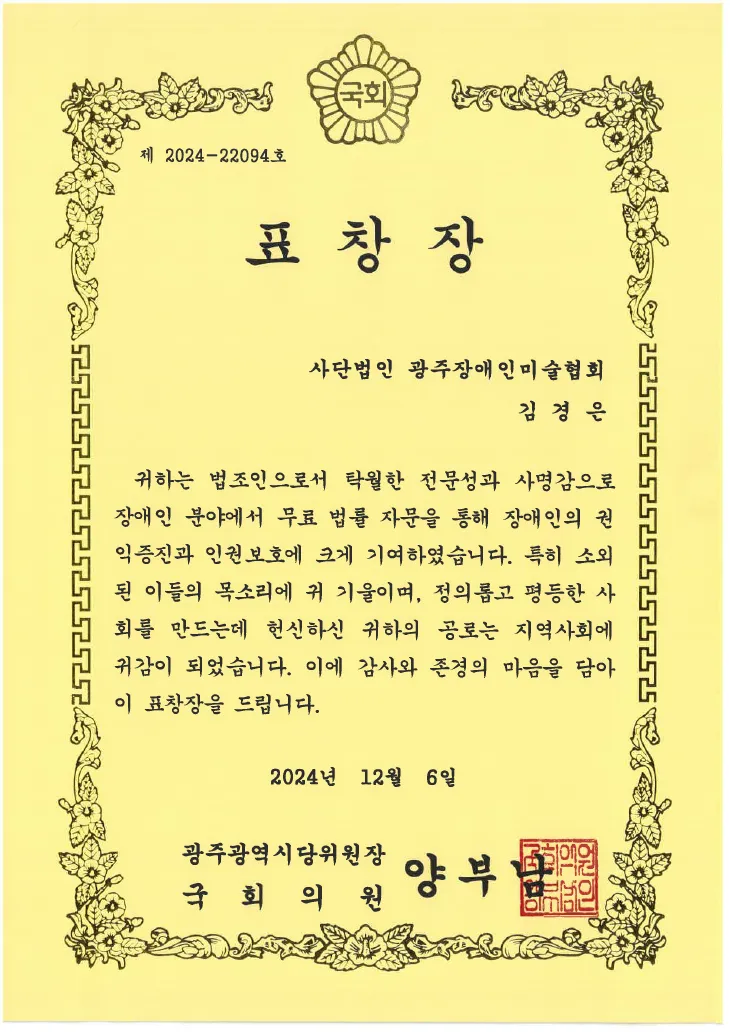 그동안 광주시의회, 광산구청, 담양군, 광주은행 등 여러 공공기관의 고문 변호사로 활동하며, 아동권리 옴부즈퍼슨, 지역아동센터 법률자문 등 사회적 약자를 위한 법률 지원에 힘써왔습니다. 이러한 노력으로 법무부 장관 감사패, 광주광역시장 표창, 대한민국 행복나눔 봉사대상 등을 수상하였으며, 대한변협이 선정한 전국 우수 변호사로도 이름을 올렸습니다.